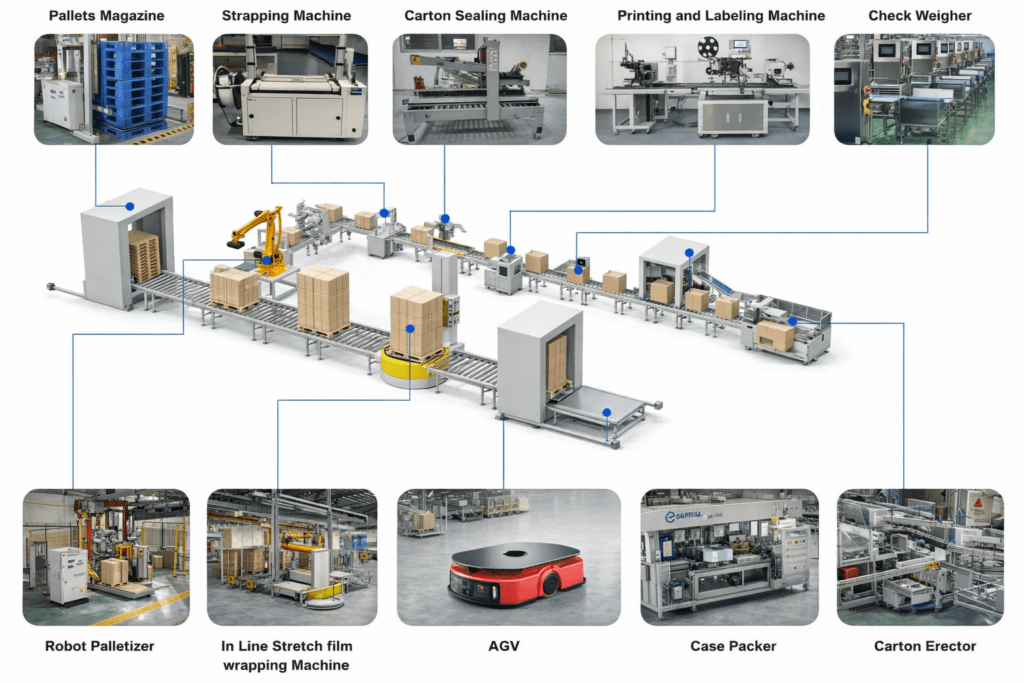 Lynopack provides a wide range of industrial packaging and automation solutions including wrapping machines, taping machines, conveyor systems, lift auto door mechanisms, robotic palletizing systems, and customized packaging lines designed for efficient production and logistics operations.
